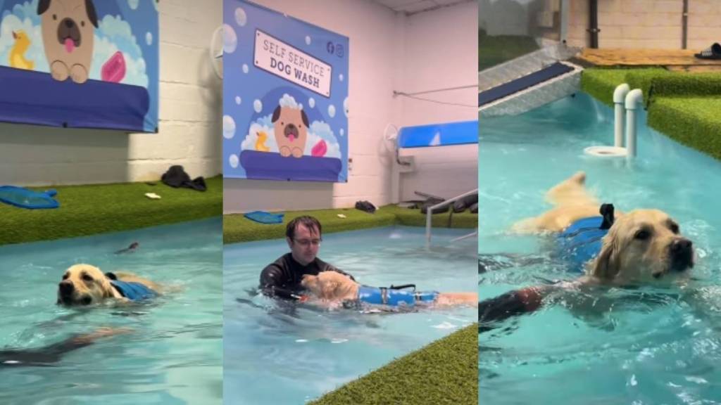 In the first part of the video, Maddie is seen in the pool with a trainer by her side. Her paws flap rapidly as she tries to stay afloat, clearly putting in the effort but also looking unsure. The trainer stays close, gently guiding her movements and offering support as she attempts to swim on her own. While Maddie doesn’t give up, it’s obvious that she’s still trying to understand what to do and how to feel comfortable in the water.