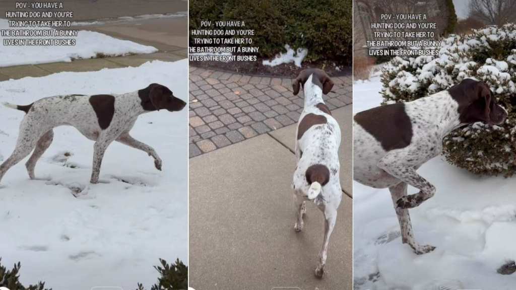 The Dog bunny video is by @pointerpawprints, the account behind Maddi and Sophie. In the clip, the owner tries to take Sophie outside for a quick bathroom break, but a bunny near the front bushes throws the plan off. The video location is outside a home in the Chicago area, with a snowy yard and shrubs framing the bunny’s hiding spot.