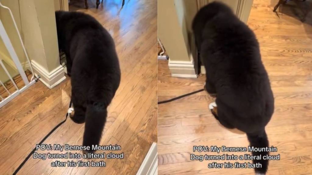 In the adorable video, CJ, a Mountain Bernese Dog, ambles across the floor after his bath. His fur looks freshly blown out and puffed up from head to tail, especially around his back, where the coat stands out in a cloud-like, rounded shape. In the background, his food and water bowls sit ready, which he eats from while his mom gushes about his beauty.