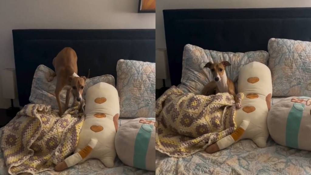 In the video, the dog starts digging at the blanket on the bed right away, and then he does a full spin. He uses his snout to move the corners around. At one point, his back legs are up on the pillow, leaning against the headrest. It looks like a very awkward position to be in, but he doesn’t stop. His human lets out a little laugh in the background while filming.