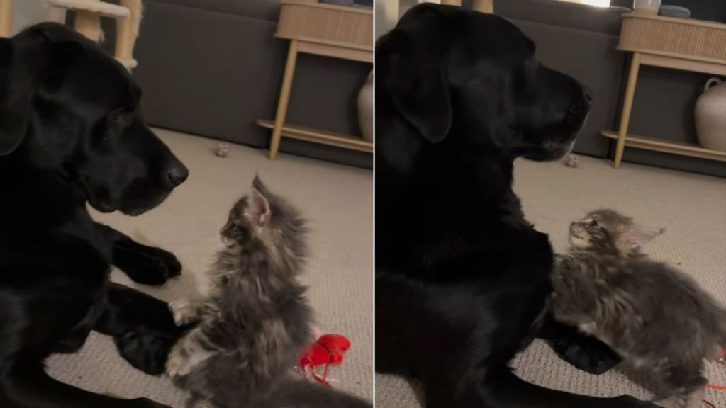 In a sweet Instagram video from user @flint.themainecoon, a fluffy Maine Coon cat makes himself very comfortable with his much larger dog sibling. The Labrador sits on the carpet like a patient saint — still and polite, and clearly trying not to encourage whatever is about to happen next — but the cat, on the other hand, has another plan.