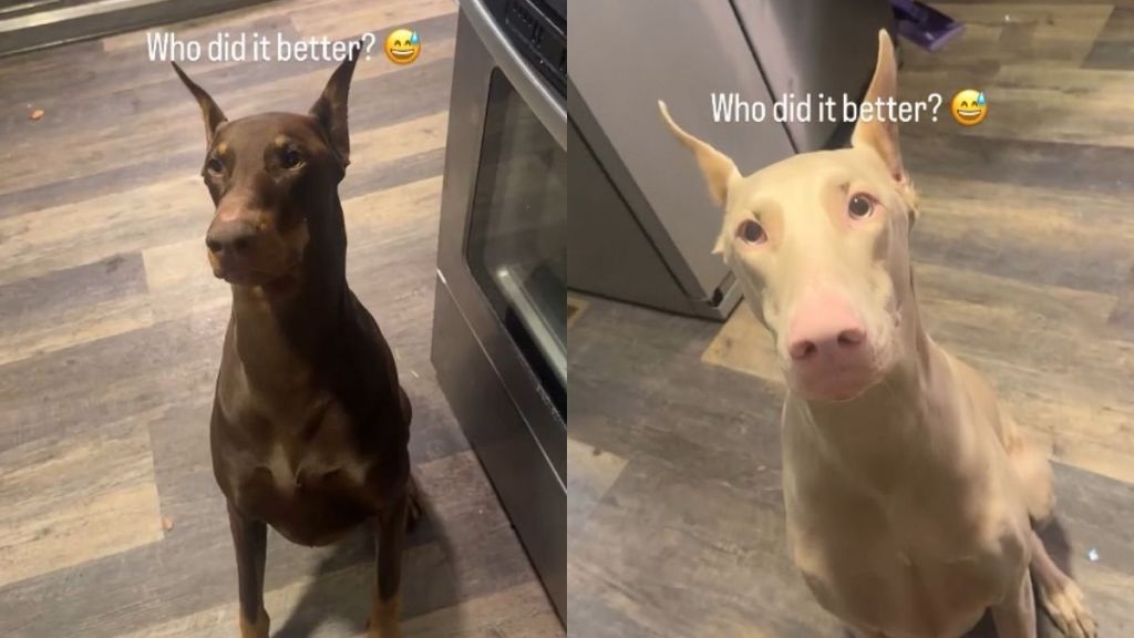 We see the Dobermans, Tony and Dakota, sitting in their Chicago kitchen and waiting for their dad to give them a very specific instruction. In this latest video, a simple command for the dogs to speak turns into a total comedy routine. Tony is ready to go, but Dakota has a much more “polite” way of handling the situation.