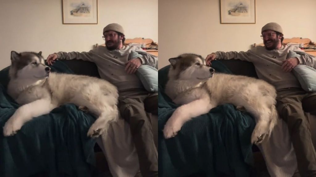 But this new video shows the dog stretched out, taking up most of the couch, while his dad is tucked into the corner holding a cushion. It’s one of those setups where both seem convinced they’re the one being squeezed.