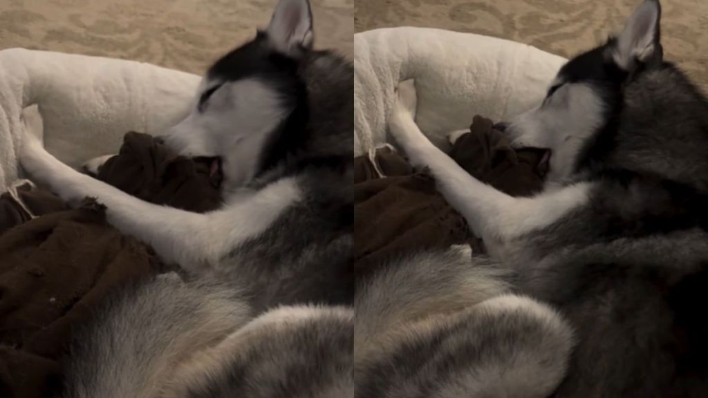 There is something undeniably adorable about seeing a big dog act like a small puppy, and this Siberian Husky is the perfect example of that. The video shows a dog named Pineapple sleeping peacefully with a blanket in his mouth.