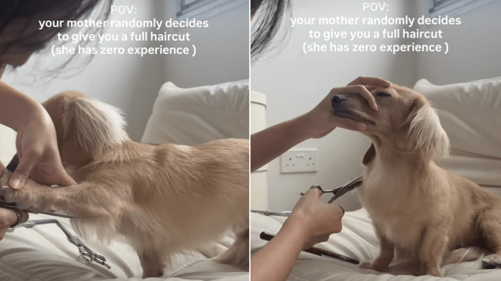 The video’s on-screen caption explains the scene with, “POV: your mother randomly decides to give you a full haircut (she has zero experience).” But the dog, for his part, stays calm during the haircut. He lets it happen, though he looks mildly confused when the scissors come out near his paws and the leg fur.