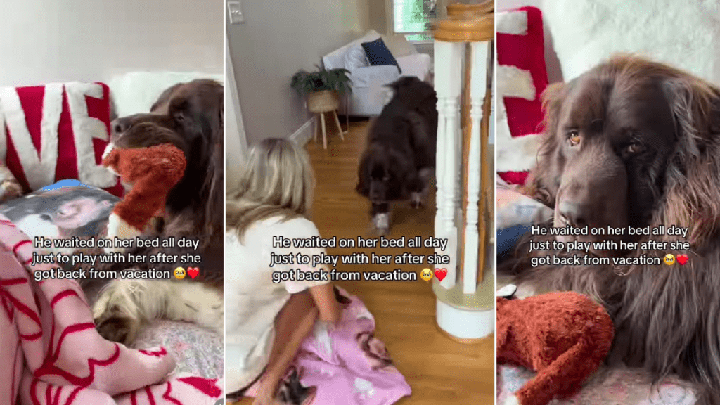 Under the video, the caption explained the wait, reading, “He waited on her bed all day just to play with her after she got back from vacation,” and their excitement upon meeting each other spoke volumes.