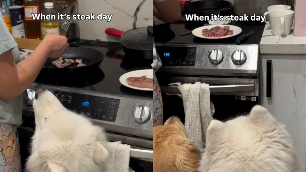 The video, posted by @bhootu_the_samoyed, features Bhootu, a fluffy Samoyed, and his Golden Retriever sibling, Chomchom, stationed firmly near the kitchen stove. From the start, it’s clear the pair know exactly what’s happening. Their attention is fixed on their owner, who is busy preparing steak.